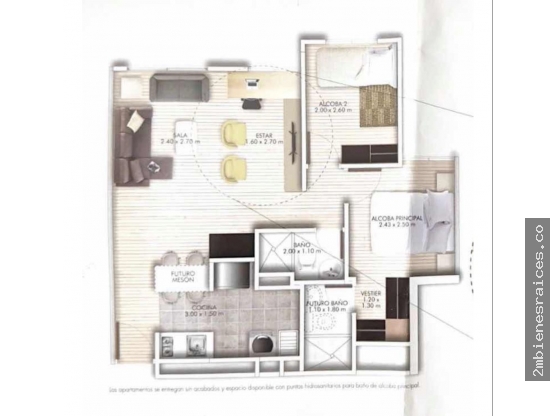 Sala-comedor, cocina abierta, zona de lavandería, 2 habitaciones - la principal con vestier y baño privado, baño de habitación y social, parqueadero