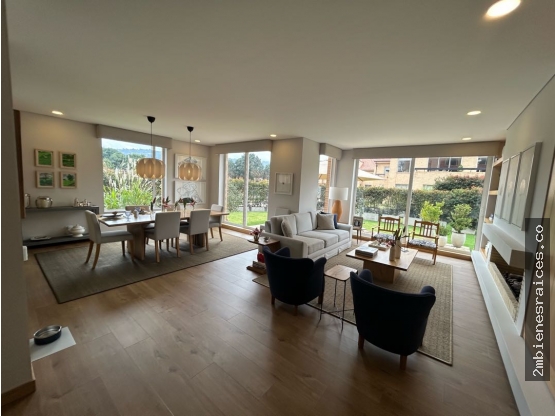 Sala con chimenea y bar, comedor, amplia terraza, jardín privado de más de 300 m2, cocina abierta con torre de hornos y lavavajillas, 3 alcobas con baño privado - la principal con moderno y amplio vestier, baño social, zona de lavandería, 3 parqueaderos cubiertos y depósito.