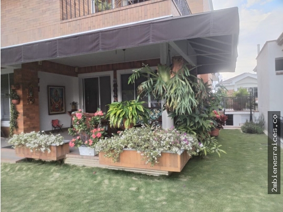 Piso 1: Garaje cubierto con depósito, hall de entrada, estudio con baño privado, baño social, sala con chimenea, comedor, cocina equipada abierta con isla, patio de ropas con salida al garaje, alcoba de servicio con baño privado, terraza cubierta y toldo para sala, terraza para comedor con parasol, jardín alrededor de la casa, semisótano con cuarto útil